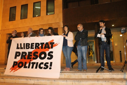 Durant l’acte s’ha llegit un manifest sol·licitant la llibertat dels presos, lectura que ha efectuat l’alcalde en funcions Francesc Barbero. Els altres membres del consistori presents a l’acte, sostenien mentrestant una pancarta amb el lema “Llibertat presos polítics”. En finalitzar la lectura, tots els presents després dels aplaudiments han cridat acompassats “Llibertat!”. Posteriorment, la pancarta s’ha ubicat al balcó de l’Ajuntament