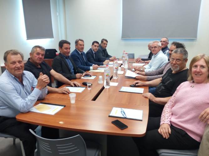 Els membres de la Junta Rectora de la cooperativa Unió, a l’inici de la reunió celebrada al Centre d’Empreses de Flix