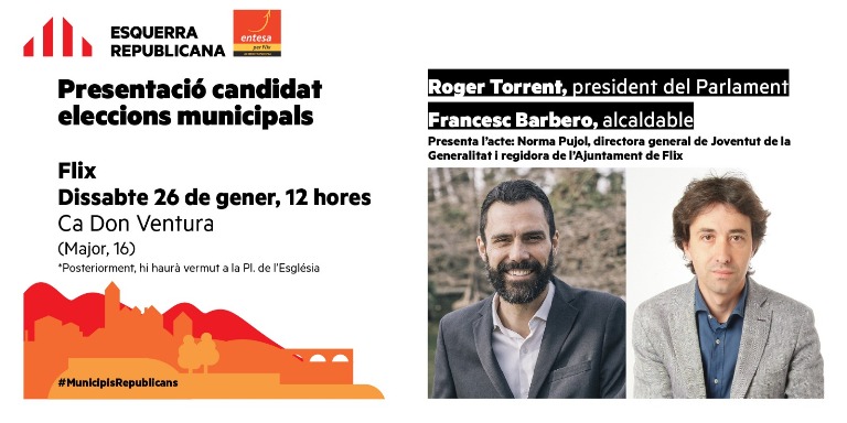 Aquest dissabte 26 de gener, a les 12 del migdia i a la sala de Ca Don Ventura es farà l’acte públic de presentació del candidat i cap de llista per ERC-Entesa per Flix per a les properes Eleccions Municipals, Francesc Barbero Escrivà. Es comptarà amb la presència i la intervenció de Roger Torrent, president del Parlament de Catalunya. La presentació de l’acte anirà a càrrec de Norma Pujol, directora General de Joventut i regidora de l’Ajuntament de Flix.
