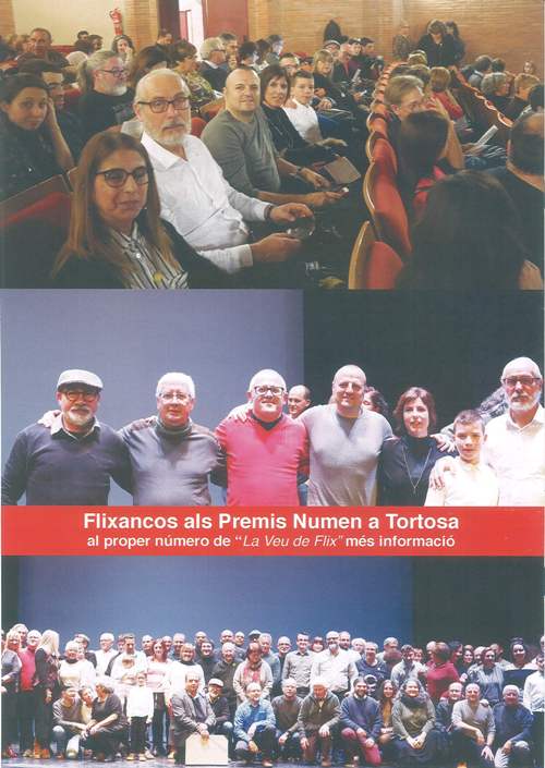 Finalment, a destacar la contraportada on hi ha imatges de l’acte de concessió dels Premis Numen a Tortosa, on es fa un reconeixement a totes les entitats i persones de les Terres de l’Ebre que van rebre algun premi o distinció durant l’any passat, i entre els quals hi havia diversos flixancos. S’indica que s’inclourà més informació en el proper número de La Veu de Flix.