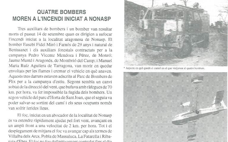 Vint-i-cinc anys després, un altre gran incendi forestal ha afectat el nostre territori, i en especial el terme de Flix. Tots i els seus efectes destructius, en aquesta ocasió sortosament no es van haver de lamentar víctimes mortals. Amb tot, des de l’Ajuntament de Flix, donada aquesta coincidència dels vint-i-cinc anys de l’incendi de Nonasp, s’ha volgut retre un homenatge pòstum als quatre membres del parc de bombers Flix que hi van perdre la vida: Eusebi Fidel Miró Farnós, natural de Benissanet, bomber professional; i els tres auxiliars forestals contractats per a aquella campanya, Pedro Vicente Mendoza Pérez, de Montsó; Jaume Munté i Aragonès, de Montbrió del Camp; i Manuel María Ruiz Aguilera, de Tarragona. L’acte es farà a demà dissabte 14 de setembre, a les 6 de la tarda al Parc de Bomberts Voluntaris de Flix.