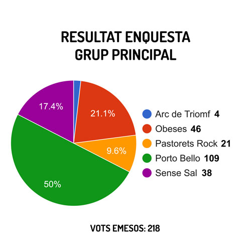 Ahir, diumenge 16 de febrer, a mitjanit, va finalitzar l’enquesta per escollir els grups que actuaran en el concert de la vespra de la propera Festa Major, realitzada amb l’aplicació Flix Actiu. La participació total va ser de 218 persones. Les opcions que van comptar amb més vots van ser “Porto Bello”, com a grup principal, i “Hey! Pachucos”, com a grup de versions.