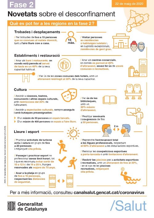 Entre les novetats que comporta la nova fase, hi ha la de permetre reunions de fins a 15 persones; la possibilitat de visitar persones que es troben a la residència; la realització de visites guiades; la realització d’actes culturals amb butaques preassignades fins a 50 persones en recintes tancats i 400 en recintes oberts; l’ús de la biblioteca fins a un 30% del seu aforament, entre altres. De totes aquelles que afectin serveis dependents de l’Ajuntament (com la Biblioteca Municipal), se n’informarà puntualment de l’inici de l’aplicació d’aquesta nova fase.
