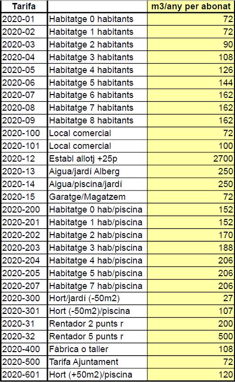 Les tipologies de consum i els seus volums corresponents són les de la següent taula: