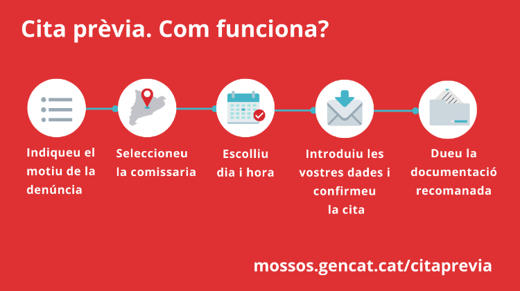 La Policia de la Generalitat-Mossos d’Esquadra ha posat en marxa un sistema de cita prèvia per a posar denúncies amb l’objectiu d’oferir un millor servei a la ciutadania. El pla s’implementa a totes les comissaries i permet una optimització del temps tant dels ciutadans que vulguin interposar una denúncia com de la pròpia comissaria, ja que podrà gestionar i redistribuir millor el volum de feina.
