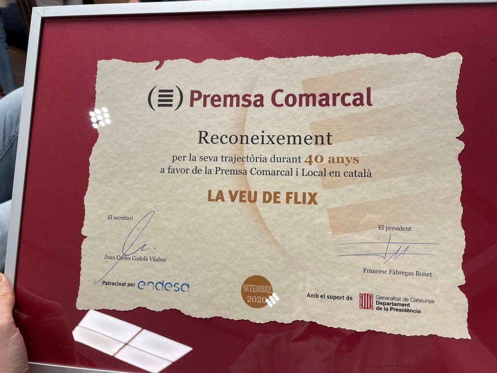 Dissabte passat 12 de juny, en el decurs de l’acte del lliurament dels guardons de l’11a edició dels Premis Premsa Comarcal, es féu un reconeixement a La Veu de Flix pels seus 40 anys de trajectòria a favor de la Premsa Comarcal i Local en català. A l’acte hi foren presents el batlle de Flix, Francesc Barbero Escrivà, i la regidora de Mitjans de Comunicació, Vera Llombart Sanjuan. L’acte s’havia de celebrar el 2020, però es va haver de posposar a causa de la pandèmia. La regidora Vera Llombart ha donat a conèixer el lliurament d’aquest guardó a través de les xarxes socials, tot manifestant que “Aquest reconeixement és per tota la gent que ha fet possible La Veu de Flix. La revista feta pel poble i per al poble“.