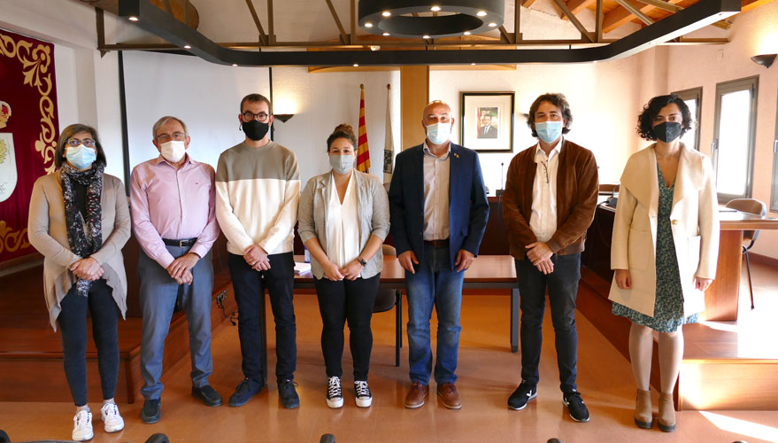 El delegat del Govern a les Terres de l’Ebre acompanyat pels membre del Consistori assistents a la reunió. D’esquerra a dreta: Carme Rosich Prunera, regidora de l’oposició; Xavier Sabaté Ibarz, regidor de Transició Ecològica; Pau Guiu Rofes, regidor de Cultura i Festes i Tradicions; Norma Pujol Farré, regidora d’Infància, Adolescència i Joventut , d’Afers Socials i d’Educació;  Albert Salvadó Fernández, delegat del Govern a les Terres de l’Ebre; Francesc Barbero Escrivà, batlle de Flix; i Gemma Abelló Treig, regidora d’Entorn Urbà  i de Patrimoni Natural i Benestar Animal.