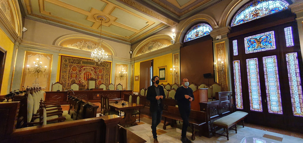 El batlle de Flix i el paer en cap visitant la Sala de Plens de la Paeria