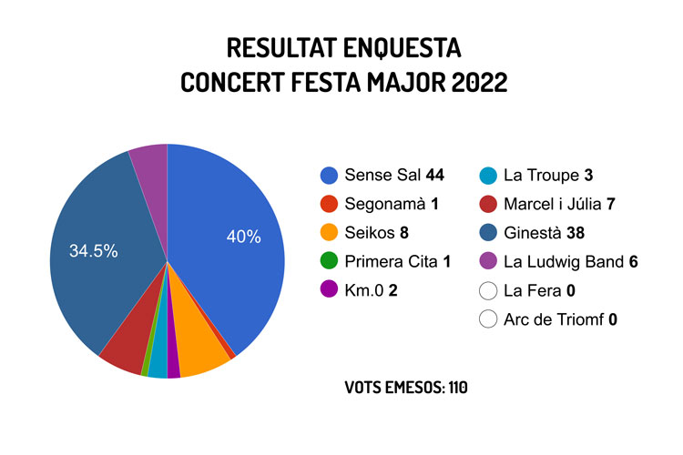 Així doncs, després de comunicar els resultats a les bandes guanyadores de l’enquesta, aquests seran els dos grups de música que actuaran la vespra de la Festa Major 2022, que aquest any serà el divendres 12 d’agost.