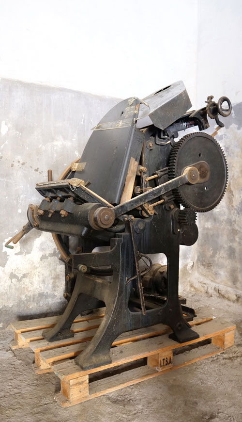 Una de les màquines tipogràfiques del fons de la Impremta Fauquer cedides. Es troba al magatzem que l’Associació Cultural La Cana disposa a les dependències de l’antic edifici de la Cooperativa Agrícola.