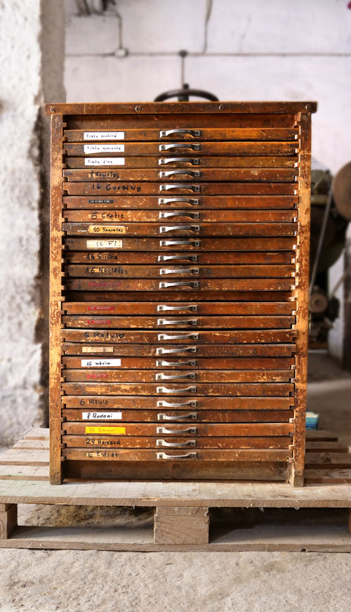 Moble amb calaixos per guardar els tipus mòbils. També es troba al magatzem de l’Associació Cultural La Cana.