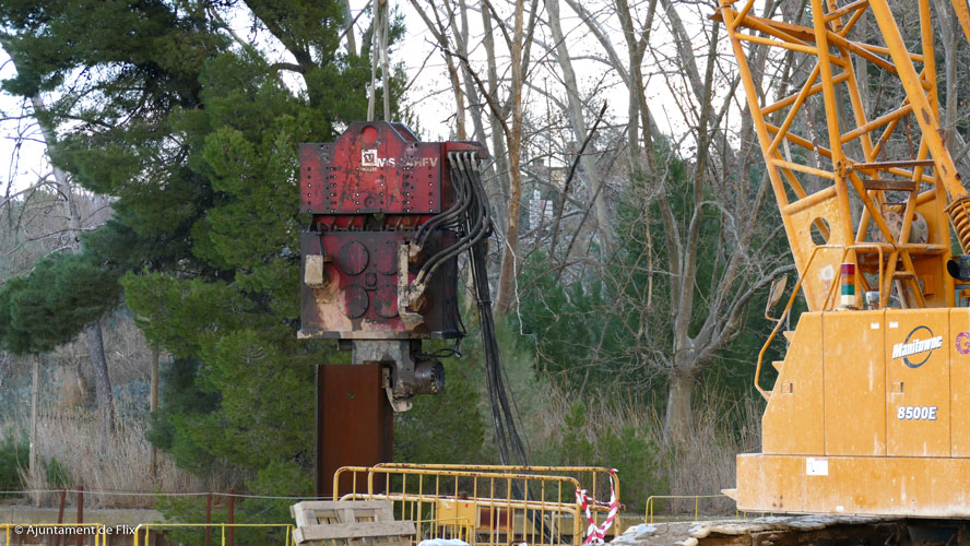 Instant d’aixecament de la primera palplanxa del mur de descontaminació de l’embassament