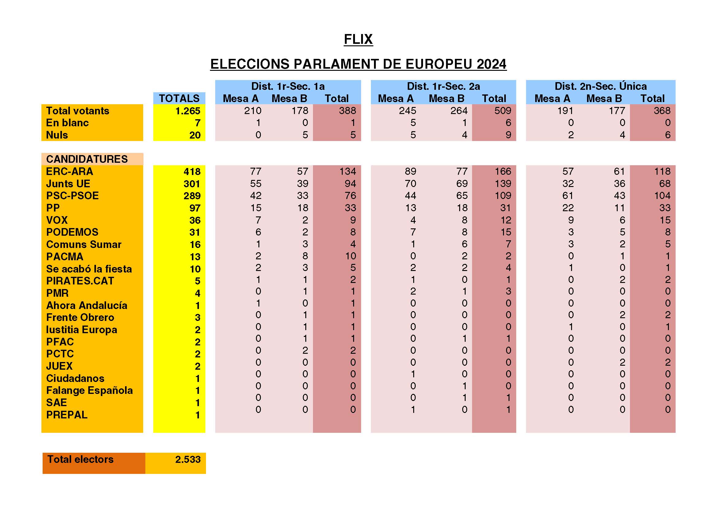 La participació a Flix a les Eleccions al Parlament Europeu celebrades ahir diumenge 9 de juny va ser de 1.265 votants, el 49,95% del total del cens (2.533), i que representa una disminució del 15,52% respecte als darrers comicis al Parlament de Catalunya el 12 de maig i un 25,27% menys que a les últimes eleccions al Parlament Europeu celebrades el 26 de maig de 2019, on la participació va ser del 75,22%.