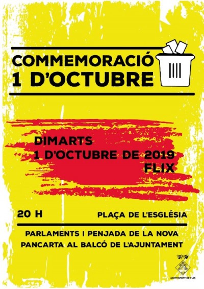 Ajuntament de Flix Avui dimarts 1 d'octubre, a les 8 de la tarda i a la plaça de l'Església, es faran els actes de commemoració del segon aniversari del referèndum de l'1 d'Octubre de 2017. Hi haurà els parlaments del batlle de Flix, Francesc Barbero; i del coordinador de l'ANC-Flix per la Independència, Ramon Bertran. [...]
