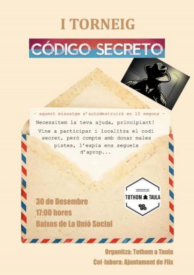 Ajuntament de Flix Organitzat per l'Associació de jocs Tothom a Taula i amb la col·laboració de l'Ajuntament de Flix, el proper dissabte 30 de desembre a les 5 de la tarda i a la sala polivalent de La Unió Social hi haurà la presentació i el I Torneig del joc "Código Secreto". Des de l'organització [...]