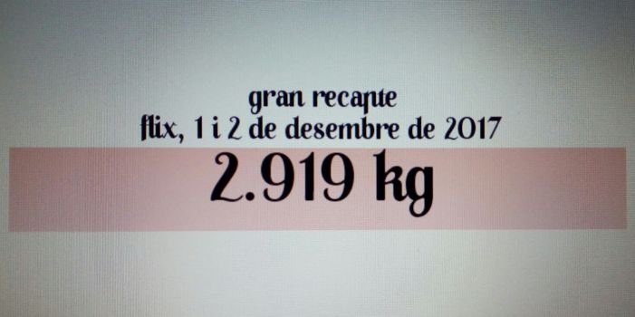 Ajuntament de Flix 2.919 kg entre aliments i productes de neteja és que s'ha recollit a Flix durant les dos jornades del Gran Recapte d'Aliments que es van dur a terme els passats dies 1 i 2 de desembre. Aquesta quantitat representa més de 1.000 kg dels que es van recollir l'any 2016 (1.741,125 kg). [...]