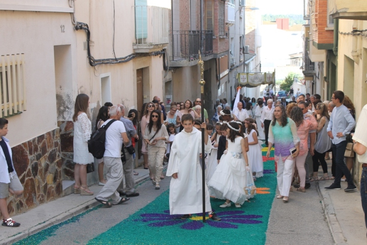 Matí: Confecció de catifes pels veïns i veïnes de Flix a la majoria de carrers i places per on transcorre la processó: P/ Església, C/ Major (perxis), C/ Girona, P/ Peixos, C/ Sant Roc, C/ Calvari, C/ La Barca, C/ Caporal Rius, C/ Lleida, P/ Major, C/ Gombau, C/ Escoles i C/ Major (tram C/ Escoles – P/ Església).