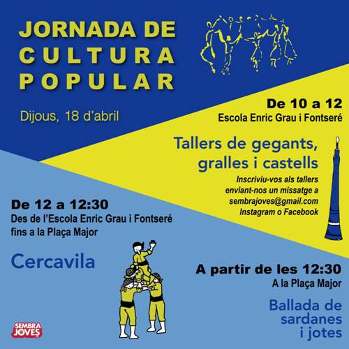 • 10.00 – 12.00 h, Escola Enric Grau Fontseré, Tallers de gegants, gralles i castells. Inscripcions enviant un missatge a sembrajoves@gmail.com, Instagram o Facebook.