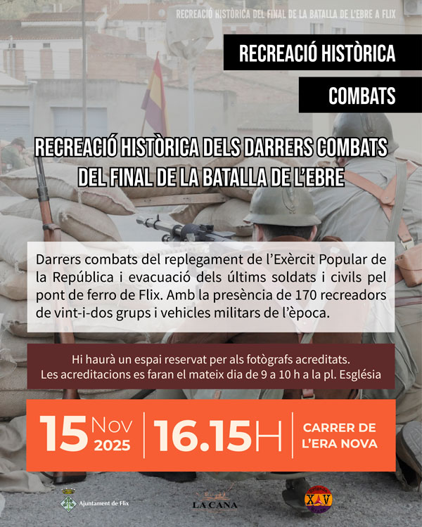 Darrers combats del replegament de l’Exèrcit Popular de la República i evacuació dels últims soldats i civils pel pont de ferro de Flix. Amb la presència de 170 recreadors de vint-i-dos grups i vehicles militars de l’època.