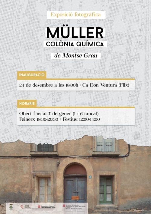 Inauguració de l'exposició fotogràfica "Müller. Colònia química", de Montse Grau. Oberta del 24 de desembre al 7 de gener Horari d'obertura: - Laborals, 18:30 a 20:30 h. - Festius, 12:00 a 14:00 h. Dies 1 i 5 de gener, tancada al públic.