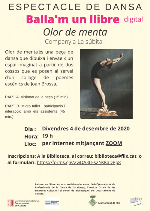 Espectacle de dansa que dibuixa i envaeix un espai imaginat a partir de dos cossos que es posen al servei d'un collage de poemes escènics de Joan Brossa. Es visualitzarà on-line mitjançant la plataforma ZOOM. Inscripcions a la Biblioteca Municipal, mitjançant correu electrònic a biblioteca@flix.cat o a través del formulari online.