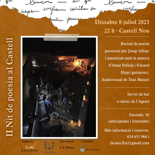 Recital de poesia amenitzat amb les guitarres d'Amat Pellejà i Eduard Hipp i amb la projecció d'una audiovisual realitzat per Toni Mataró. L'acte estarà presentat per Josep Albiac i organitzat per l'Associació Cultural La Cana gràcies a la idea original de J. A. Muñoz de Flix Poètic , també organitzador. Albert Guiu, Helena Bagés, Remei […]