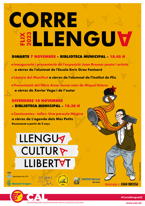 El Correllengua treballa per la difusió de l'ús de la llengua i la promoció de la cultura popular de les terres de parla catalana, des d'una aposta lúdica, festiva, participativa i transversal. Programa: Inauguració i presentació de l'exposició "Joan Brossa: poeta i artista" a càrrec de l'Escola Enric Grau i Fontseré Lectura del Manifest del Correllengua 2023 […]